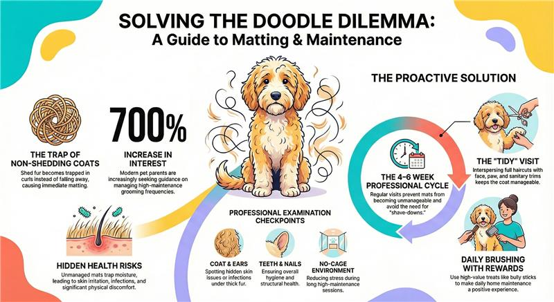 Our data shows a 700% increase in interest in how often dogs should be groomed. For Doodles, frequency is essential to avoid the "shave-down." We recommend: